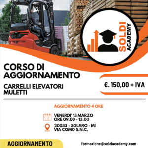 Il Corso di Aggiornamento per Addetti alla Conduzione di Carrelli Elevatori Industriali (Muletti) è il percorso formativo obbligatorio per legge per i lavoratori già in possesso dell’abilitazione alla conduzione dei carrelli elevatori, come previsto dal D.Lgs. 81/2008 art. 73 e dal nuovo Accordo Stato-Regioni.